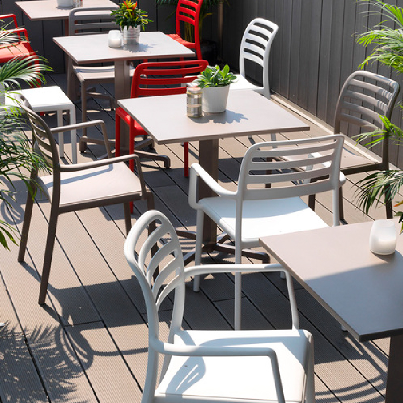 輕便、實用和舒適座椅的基本線條。Costa 是一款帶扶手和板條靠背的戶外椅子,無縫管狀樹脂框架,具有圓形輪廓和邊角。