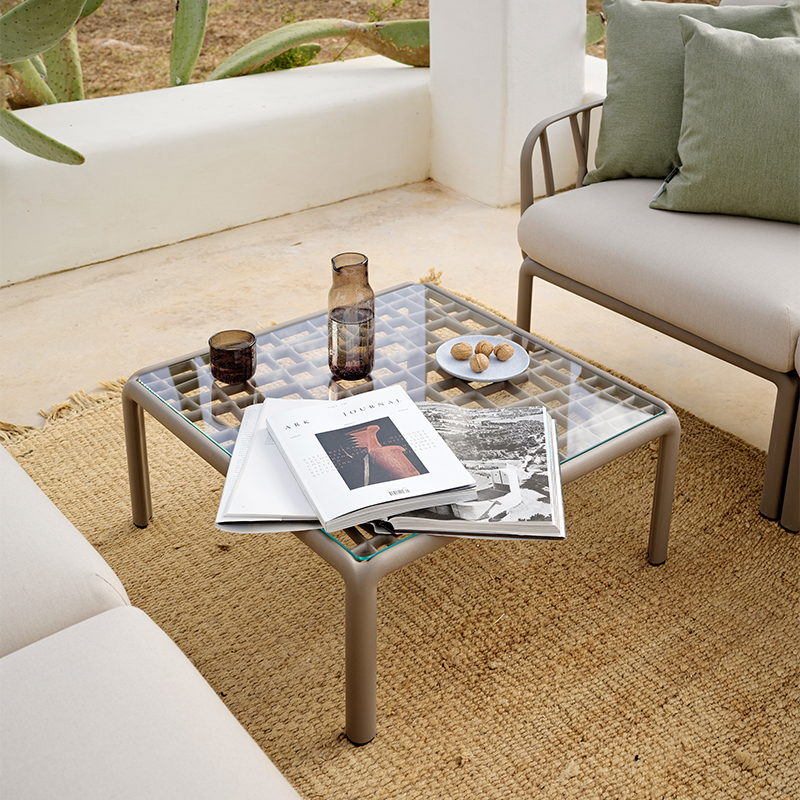 來自 Komodo 戶外家具模組化座椅系列的元素。這是一款大而實用的邊桌,配有玻璃或玻璃纖維樹脂桌面。也可單獨購買。
