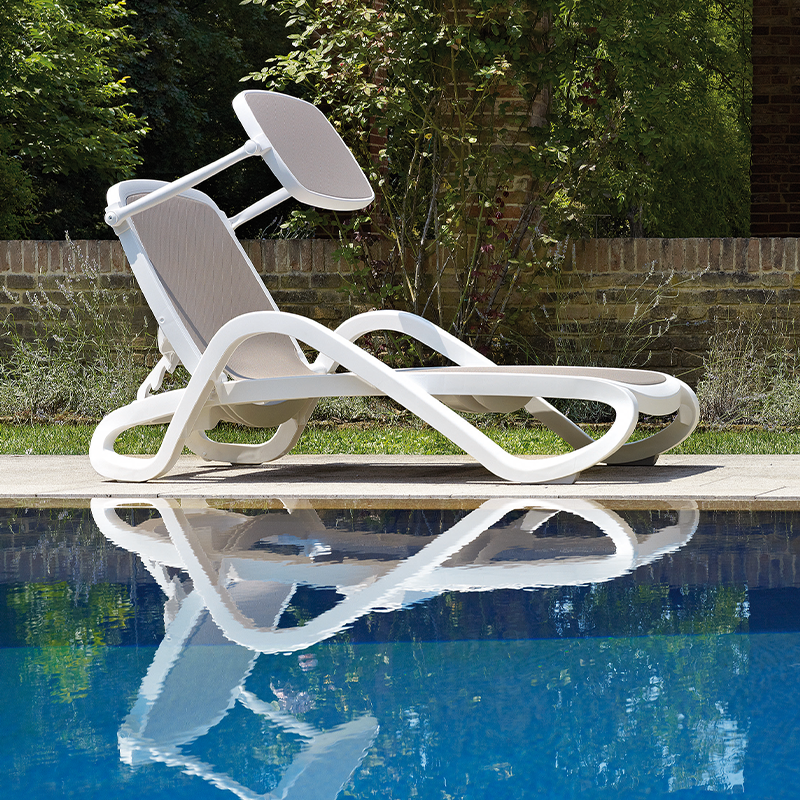 附扶手的日光躺椅採用管狀樹脂框架和透氣合成布料。靠背可調整至四個位置。有多種框架/織物顏色組合可供選擇。可堆疊。